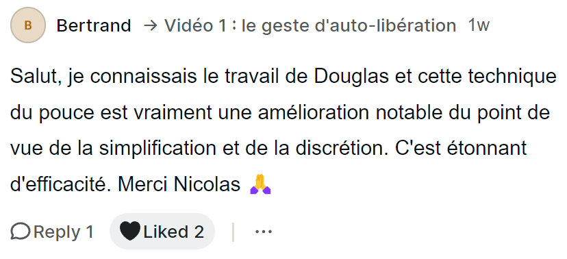 Sur une inspiration, tu effectues ton geste d’auto-libération en bougeant ton pouce de quelques millimètres.